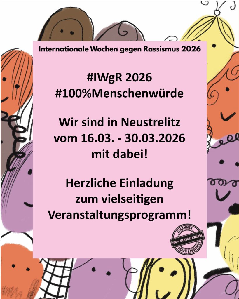 Neustrelitz greift auch in diesem Jahr die Aktionswochen der Stiftung gegen Rassismus auf und macht mit einem Veranstaltungsprogramm auf die Themen Rassismus und Alltagsdiskriminierung aufmerksam. Das Programm wird gemeinsam von verschiedenen Trägern und Organisationen aus Neustrelitz umgesetzt.